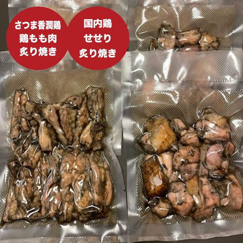 香潤鶏もも肉の炭火炙り焼き1袋約120gx3袋と国産鶏せせり炙り焼き1袋約120gx3袋の2種類を味わえるお得な2種類セット。